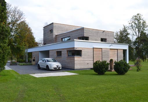 Die beiden Hälften unterscheiden sich optisch und bieten je Einheit eine zusätzliche Einliegerwohnung. Die gestaffelten Raumvolumen umfassen ein bis drei Stockwerke, sind mit horizontaler Lärchenholzschalung verkleidet und erinnern bezüglich ihrer Proportionierung an eine zeitgenössische Villa.