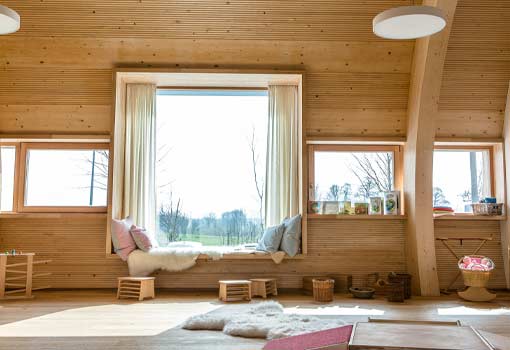 Wie ein Kokon wölbt sich der 5 m hohe Holzbau über die Grundfläche der integrativen Krippe in der zwölf Kinder im Alter von ein bis drei Jahren mit und ohne Handikap betreut werden. Tatsächlich ließ sich die Architekten durch das Kinderbuch Die kleine Raupe Nimmersatt zu der tonnenförmigen Baukörper Form inspirieren. Am Ende der Geschichte entfaltet sich die Raupe zu einem prachtvollen Schmetterling. Das gebäude ist als reiner Holzbau auf einer Stahlbetonplatte realisiert worden. Fünf gebogene Leimbinder im Achsenabstand von 5 m bilden die Tragkonstruktion. Außen auf die Bögen montierte Fichtenbrett Stapelelemente bilden Dachkonstruktion und Innendecke zugleich.