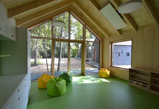 Südlich des Tonwerk Weiers, mitten im Waldgebiet hat die Stadt Kolbermoor ein außergewöhnliches Konzept umgesetzt. Der naturnahe Kindergarten für 4 Gruppen bietet zum einen die Vorzüge eines Waldkindergartens, in dem die Kinder möglichst viel Zeit in der freien Natur verbringen, aber zum andern auch den Komfort von beheizten und lichtdurchfluteten Kindergartenräumen. Durch die konzeptionelle Besonderheit und dem bewussten Verzicht auf Komfort konnte der Kindergarten zu einem sensationell günstigen Baupreis erstellt werden – trotz Corona. Der Kindergarten besteht daher auch lediglich aus 4 Gruppenräumen, 2 Garderoben, 2 kleineren Multifunktions-räumen und einem Sanitärraum für alle. Um an diesen besonderen Ort so wenig wie möglich in den Waldboden einzugreifen, wurden die Massivholzhütten auf Erdschrauben gegründet.